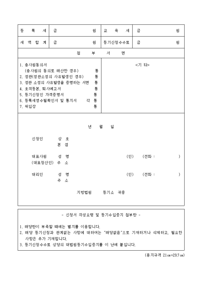 9,000원/월상호, 본점, 등기의 목적, 등기의 사유, 등기할 사항등을 기입하며 필요한 서류로는 총사원동의서(총사원의 동의로 해산한 경우), 정관(정관소정의 사유발생인 경우), 정관 소정의 사유발생을 증명하는 서면, 호적등본, 퇴사예고서, 등기신청인 자격증명서, 등록세영수필확인서 및 통지서, 위임장이 있습니다.