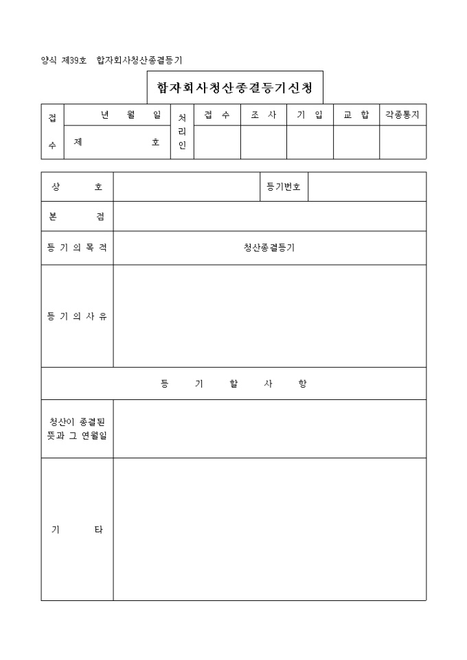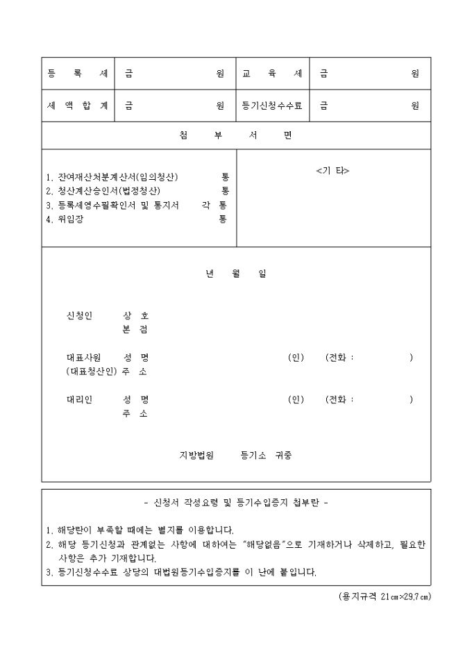 9,000원/월상호, 본점, 등기의 목적, 등기의 사유, 등기할 사항 등을 기입하며 필요한 서류로는 잔여재산처분계산서(임의청산), 청산계산승인서(법정청산), 등록세영수필확인서 및 통지서, 위임장이 있습니다.