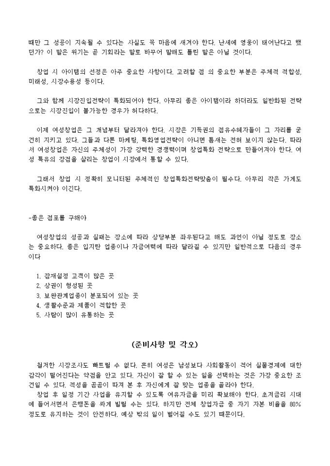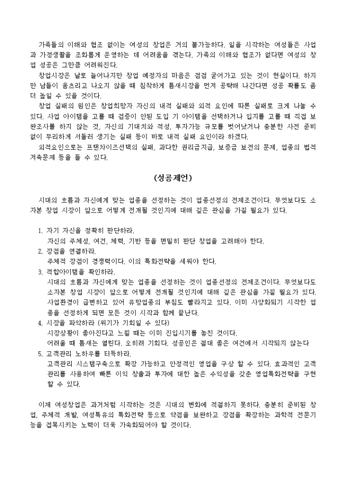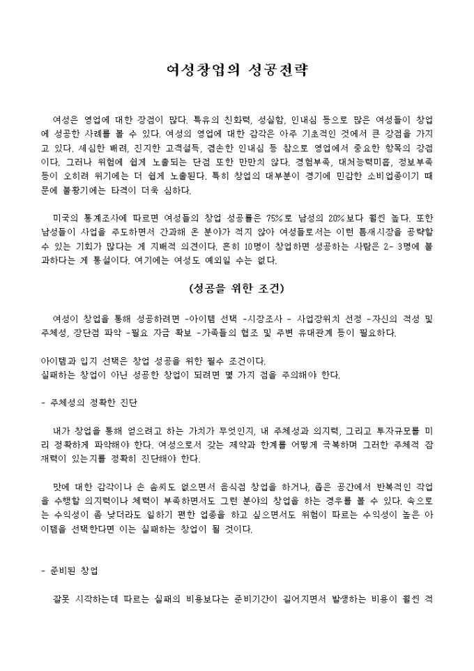 9,000원/월여성이 영업하였을 경우 장점들에 대해 설명하며 여성 창업의 성공 전략을 6가지로 간략하게 설명하였으며 그외 준비사항 및 각오, 성공에 대한 제언 등의 대한 내용입니다.