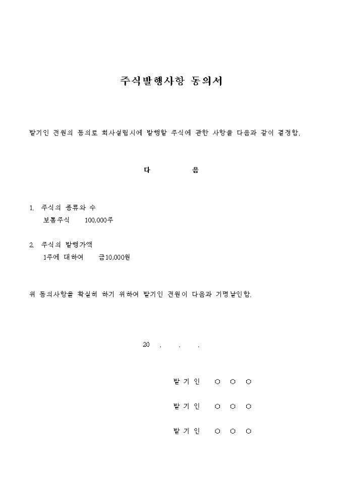 회사설립시에 발행할 주식의 종류와 수 및 발행가액에 대해 발기인 전원이 동의함을 증명하는 서식입니다.