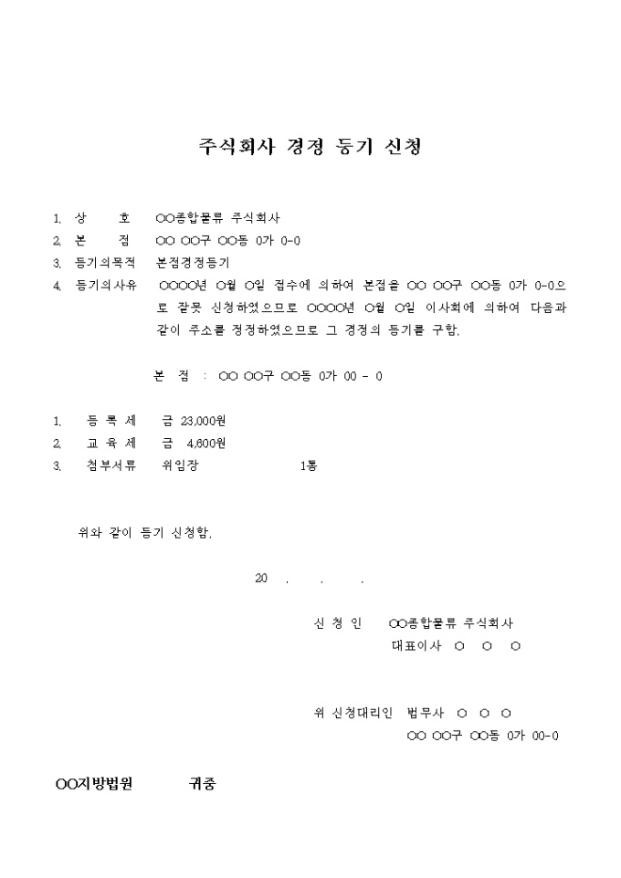 9,000원/월본점주소의 정정을 위한 주식회사 경정 등기 신청서입니다.