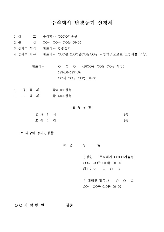 주식회사 변경 등기 신청서(대표이사 변경등기)