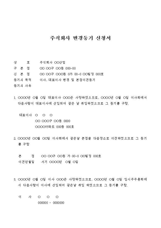 대표이사의 사망으로 인한 대표이사 변경 및 이사변경과 본점이 이전함을 등기하는 주식회사 변경등기 신청서입니다.