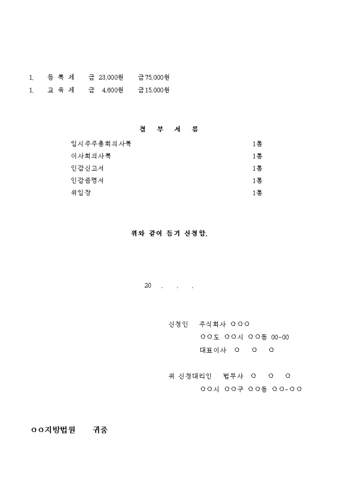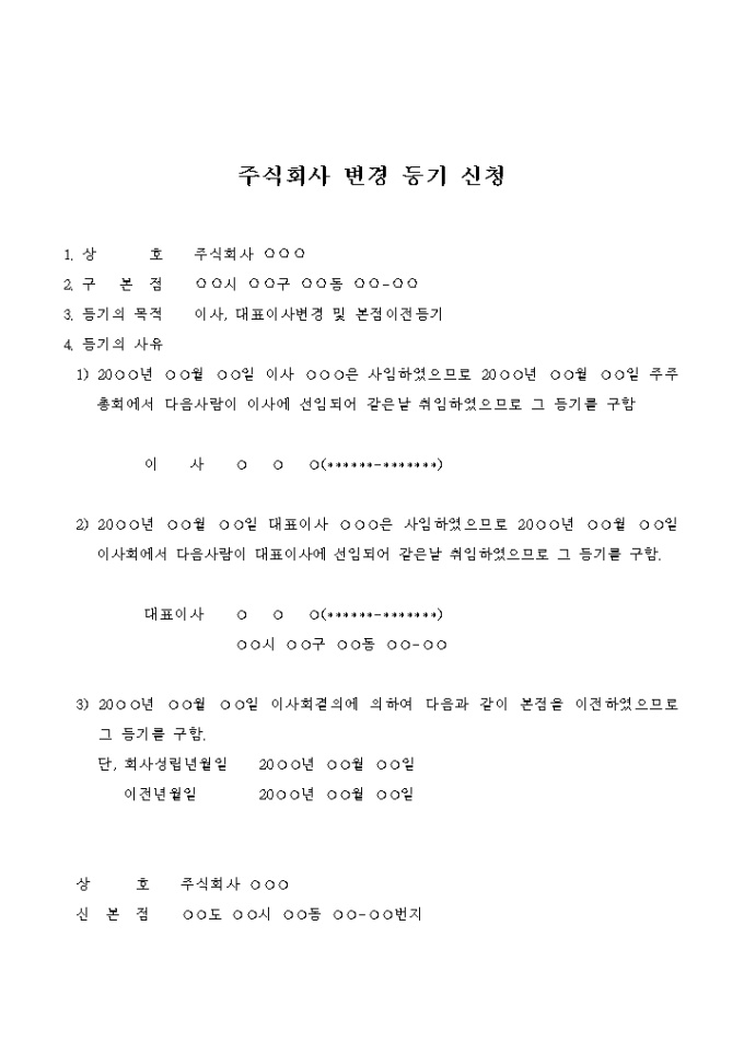 주식회사 변경 등기 신청서(이사, 대표이사변경 및 본점이전등기)