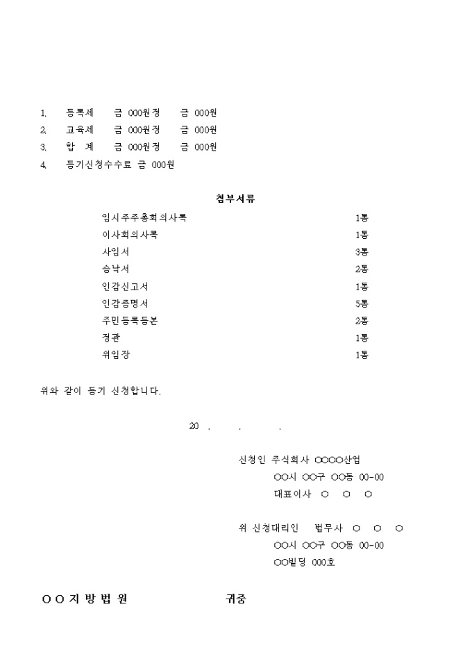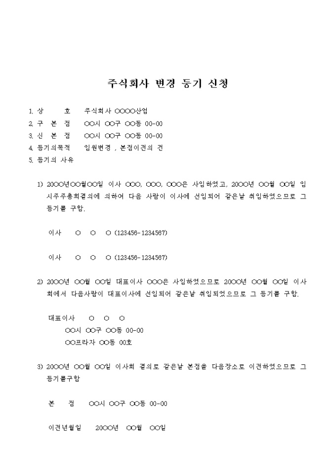 9,000원/월이사와 대표이사의 사임과 선임으로 인한 임원변경 및 본점의 이전을 등기하는 주식회사변경등기의 신청서입니다.