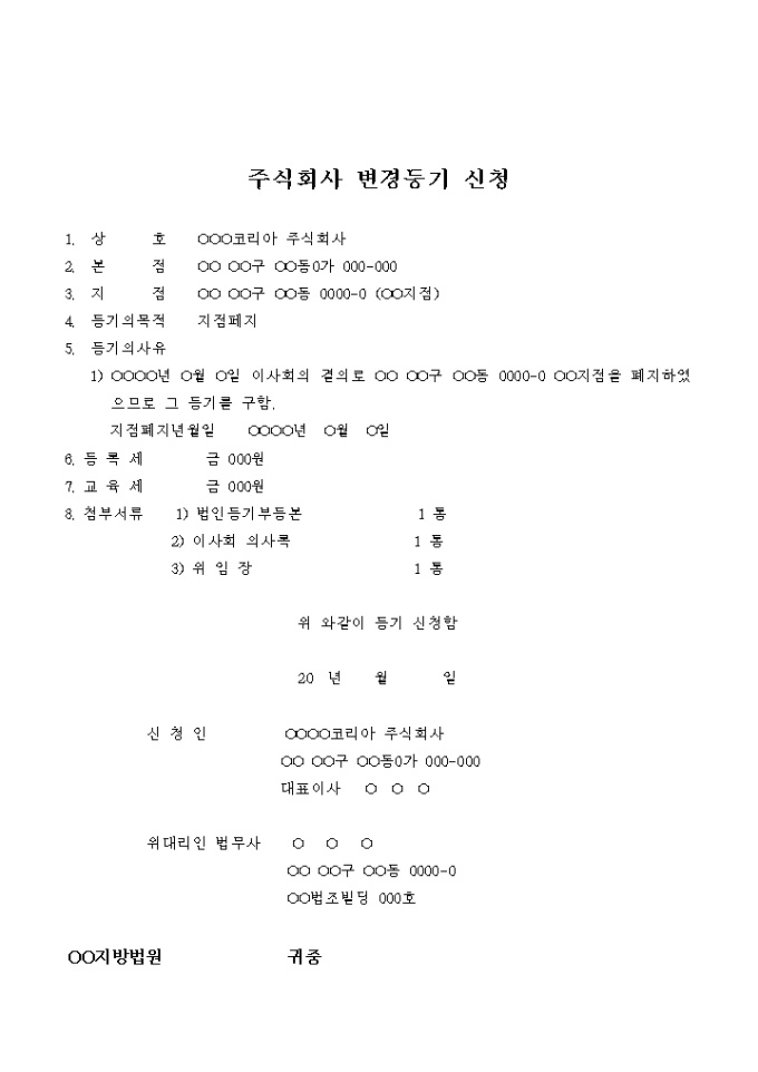 이사회의 결의로 지점이 폐지되었음을 등기하는 주식회사 변경 등기 신청서입니다.