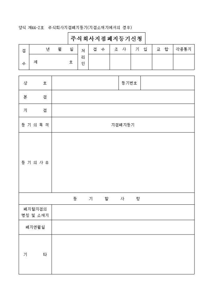 9,000원/월주식회사의 지점 폐지를 목적으로 하는 등기로써 지점소재지에서의 경우에 해당되는 서식입니다. 첨부하는 서류로는 본점등기부등본, 등록세영수필확인서 및 통지서, 위임장
