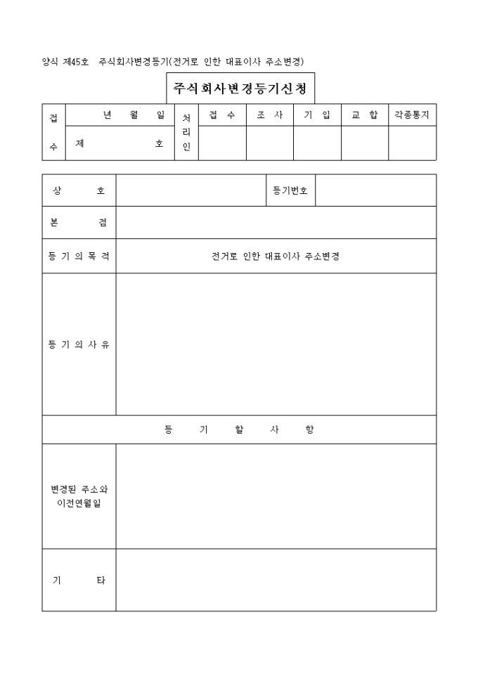 주식회사 변경등기(전거로인한대표이사주소변경)(양식 제45호)