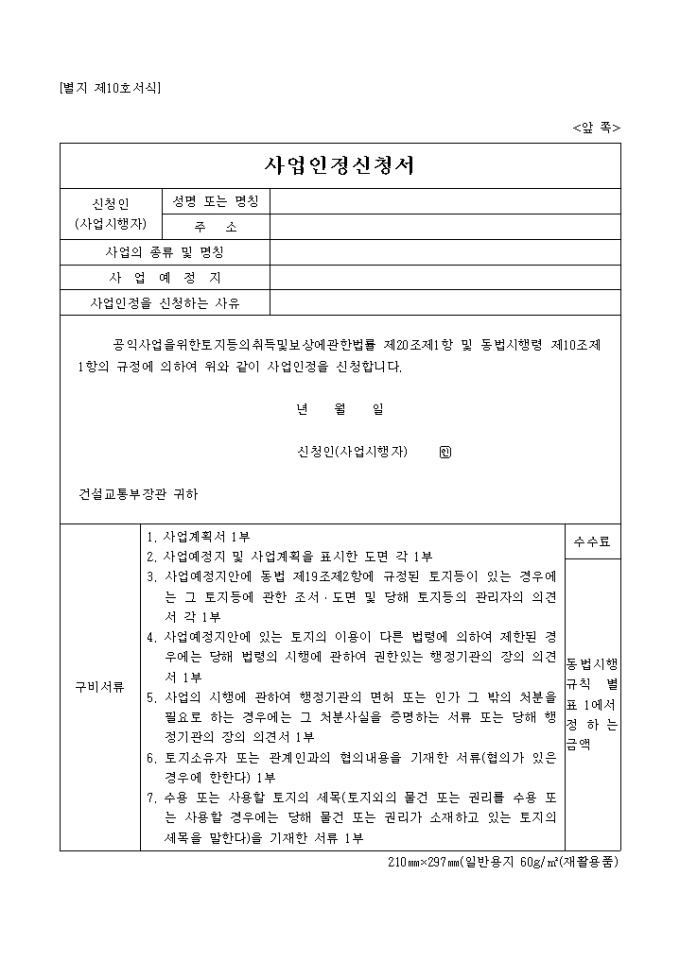 9,000원/월공익사업을 위한 토지등의 취득 및 보상에 관한 법률 제20조 제1항 및 동법시행령 제10조 제1항의 규정에 의거한 사업인정신청서 입니다.