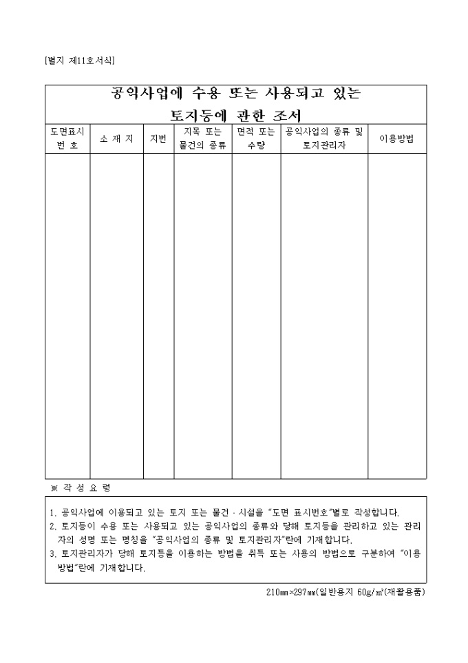 공익사업에 수용 또는 사용되고 있는 토지등에 관한 조서(별지 제11호)