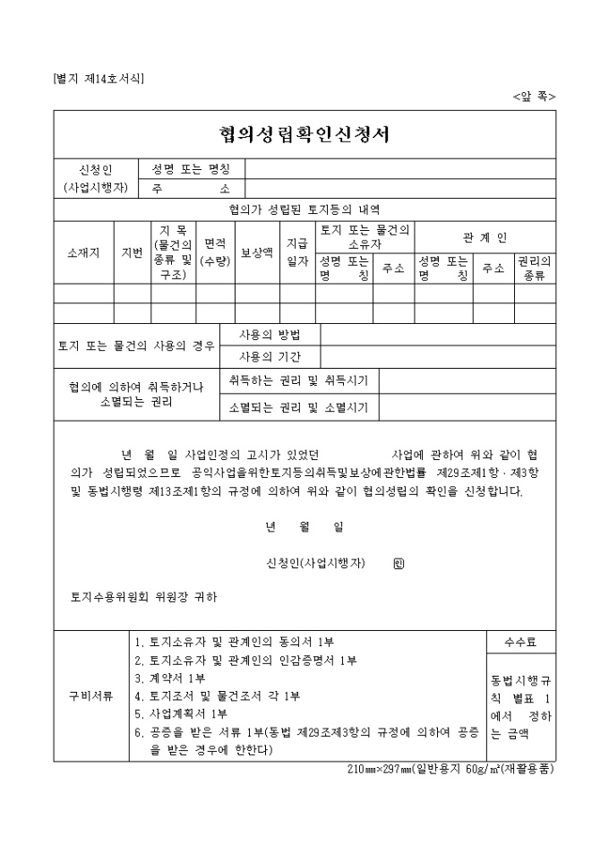 9,000원/월공익사업을 위한 토지등의 취득 및 보상에 관한 법률 제29조 제1항·제3항 및 동법시행령 제13조 제1항의 규정에 의거한 협의성립 확인신청서 입니다.