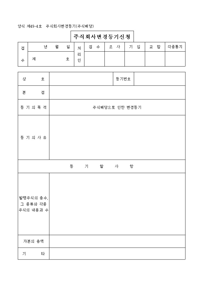 9,000원/월등기할 사항에는 발행주식의 총수, 그 종류와 각종 주식의 내용과 수, 자본의 총액, 기타가 있으며 첨부해야 하는 서류로는 주주총회의사록, 이익금의 존재를 증명하는 서면, 등록세영수필확인서 및 통지서, 위임장이 있습니다.
