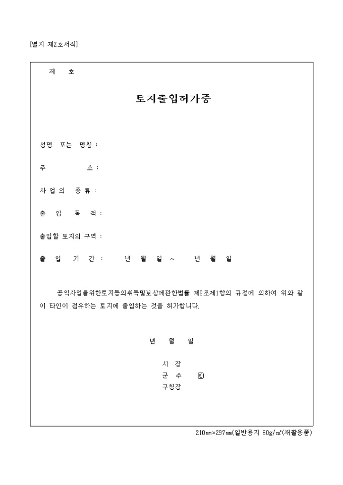 9,000원/월공익사업을 위한 토지등의 취득 및 보상에 관한법률 제9조 제1항의 규정에 의거한 타인 점유토지 출입시의 허가증입니다.