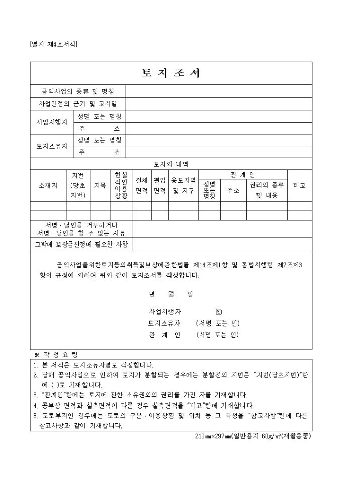 공익사업을 위한 토지등의 취득 및 보상에 관한법률 제14조제1항 및 동법시행령 제7조제3항의 규정에 의거한 토지조서 양식입니다.
