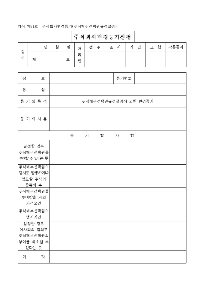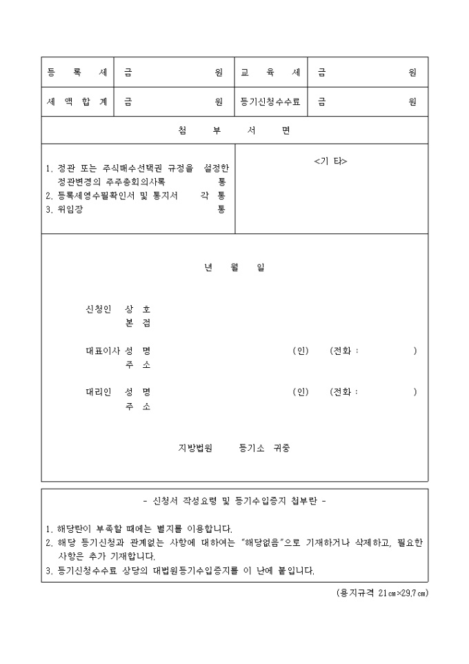 9,000원/월주식매수선택권규정설정에 의한 변경을 목적으로 하는 등기로써 첨부해야 하는 서류로는 정관 또는 주식매수선택권 규정을 설정한 정관변경의 주주총회의사록, 등록세영수필확인서 및 통지서, 위임장이 있습니다