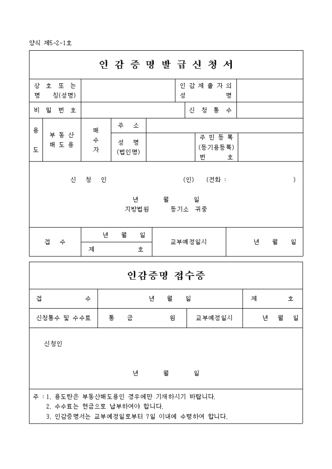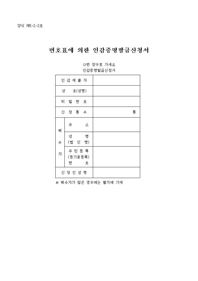 인감증명 발급 신청을 위한 서식으로 인감증명 발급신청서, 인감증명 접수증, 번호표에 의한 인감증명발급신청서로 구성되어 있습니다.