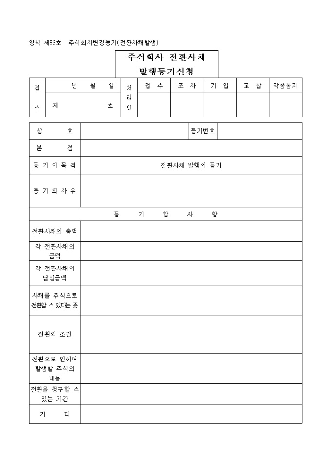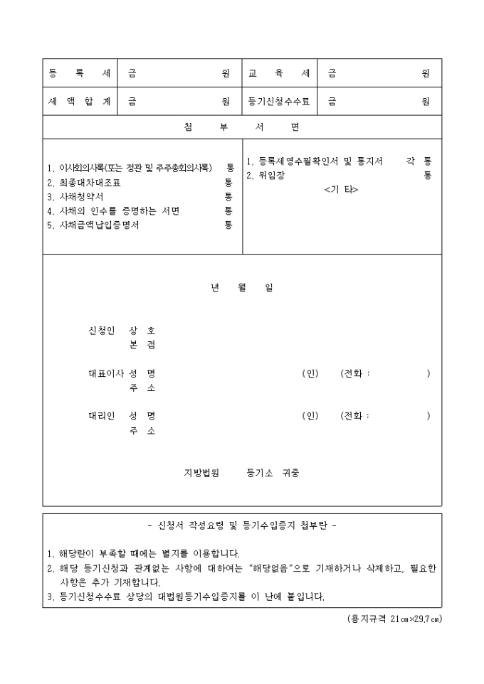 9,000원/월전환사채 발행의 목적으로 하는 등기로써 첨부해야 하는 서류로는 이사회의사록, 최종대차대조표, 사채청약서,사채의 인수를 증명하는 서면, 사채금액납입증명서, 등록세영수필확인서 및 통지서, 위임장이 있습니다.