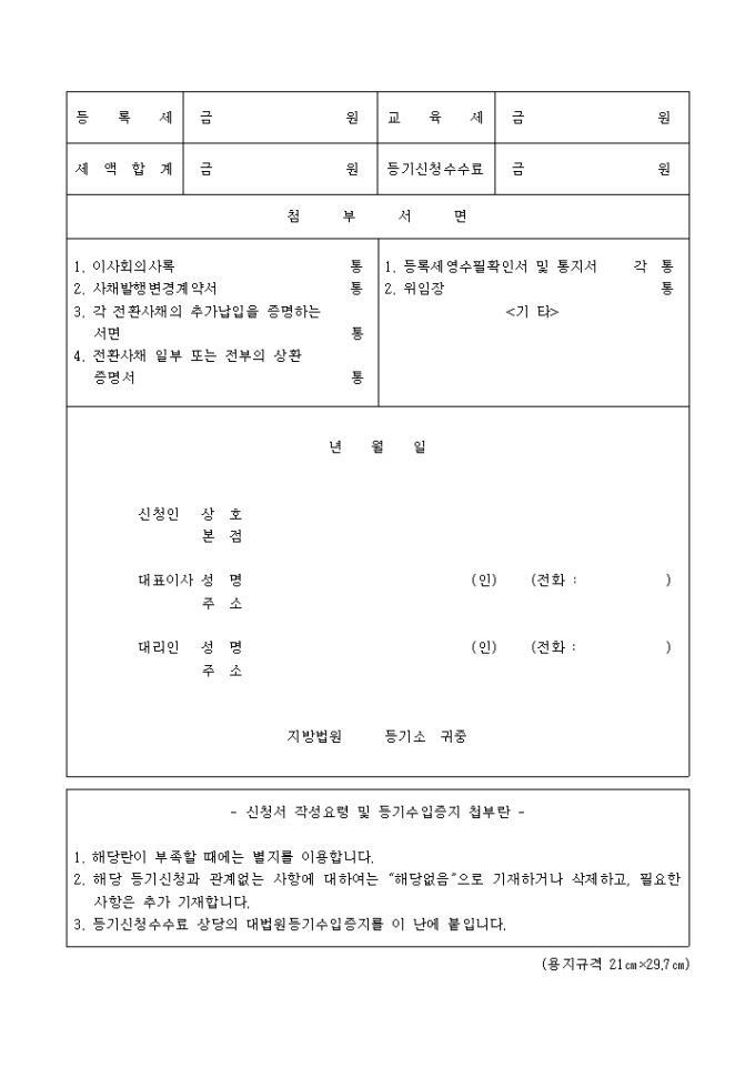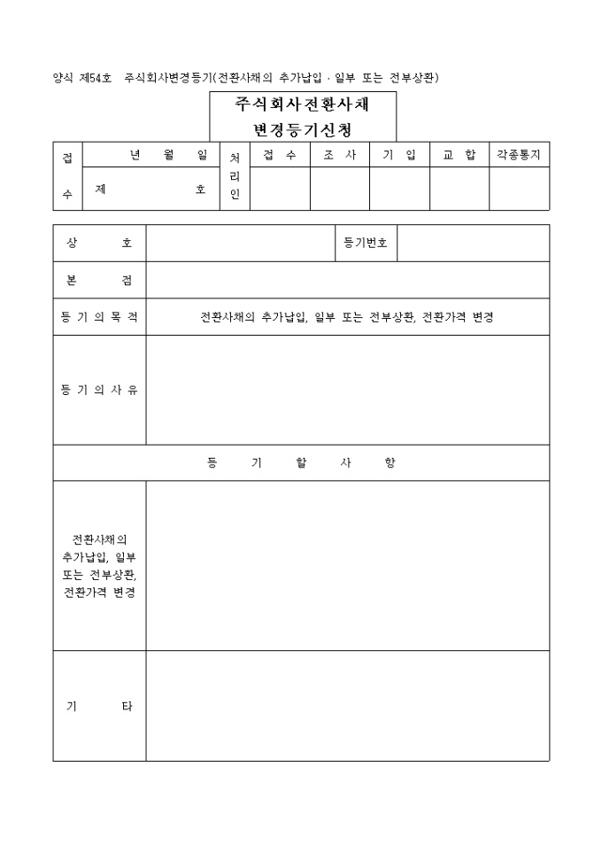 9,000원/월전환사채의 추가납입, 일부 또는 전부상환, 전환가격 변경을 목적으로 하는 등기로써 전환사채의 추가납입, 일부 또는 전부상환, 전환가격 변경 사항등을 기재 해야 합니다.