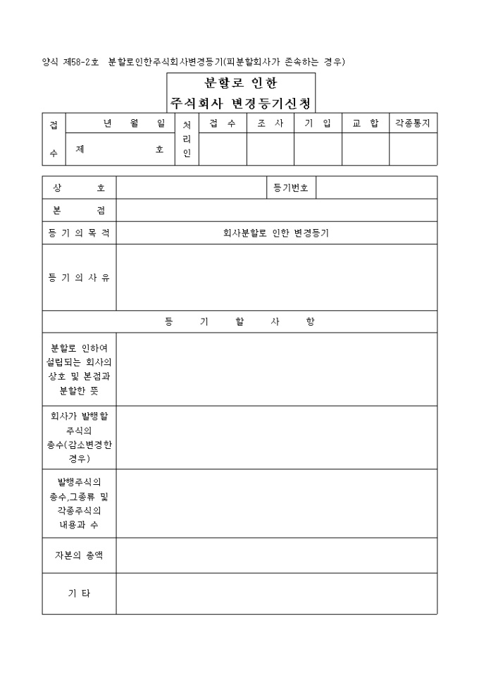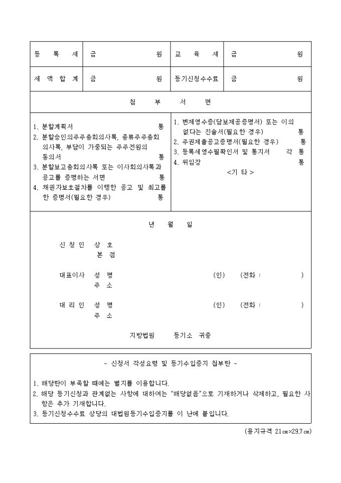 9,000원/월회사분할로 인한 변경을 목적으로 하는 등기로써 분할로 인하여 설립되는 회사의 상호 및 본점과 분할한 뜻, 등기의 사유등을 기재 해야 합니다.