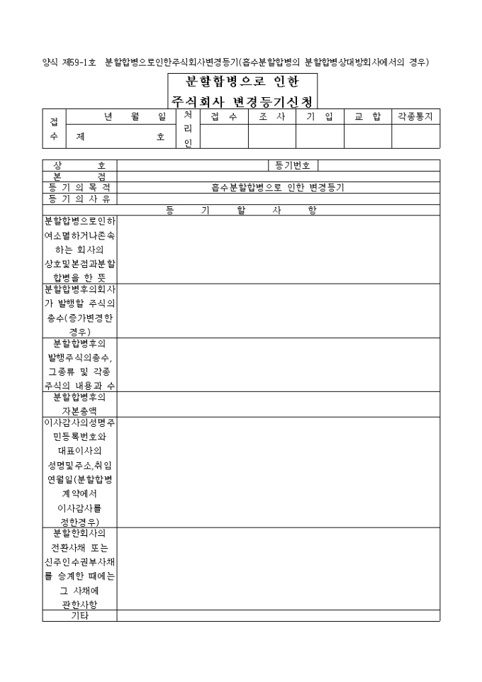 9,000원/월흡수분할합병으로 인한 변경을 목적으로 하느 등기로써 분할합병으로인하여소멸하거나존속하는 회사의 상호및본점과분할합병을 한 뜻등을 기재해야 합니다.