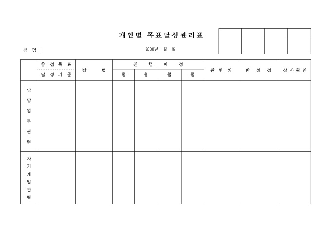 개인별 담당업무나 자기계발에 관한 목표 세우고 관리하는 양식입니다. 목표를 명시하고 방법과 진행예정.그리고 관련처, 반성점등을 작성합니다.