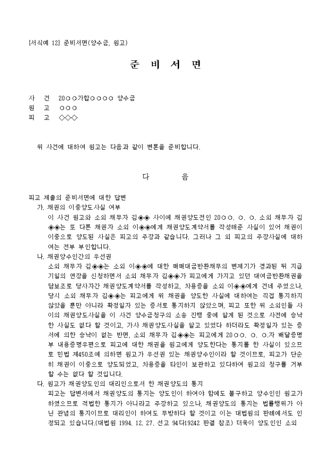 9,000원/월[서식예 12] 준비서면(양수금)은 이 사건 원고와 소외 채무자 김◈◈ 사 이에 채권양도전인 20○○. ○. ○. 소외 채무자 김◈◈는 또 다른 채권자 소외 이◈◈에게 채권양도계약서를 작성해준 사실이 있어 채권이 이중으로 양도된 사실은 피고의 주장과 같습니다. 그러나 그 외 피고의 주장사실에 대하여 는 전부 부인하는 내용입니다.