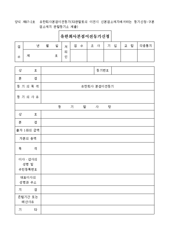 9,000원/월유한회사본점이전등기(타관할로의 이전시 신본점소재지에서하는 등기신청-구본점소재지 관할등기소 제출)입니다.