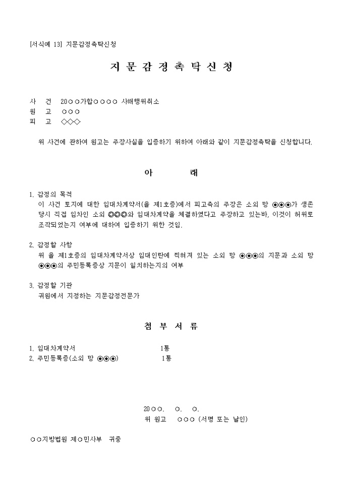 [서식예 13] 지문감정촉탁신청은 지문이 일치하는지 감정을 의뢰하는 신청서입니다.