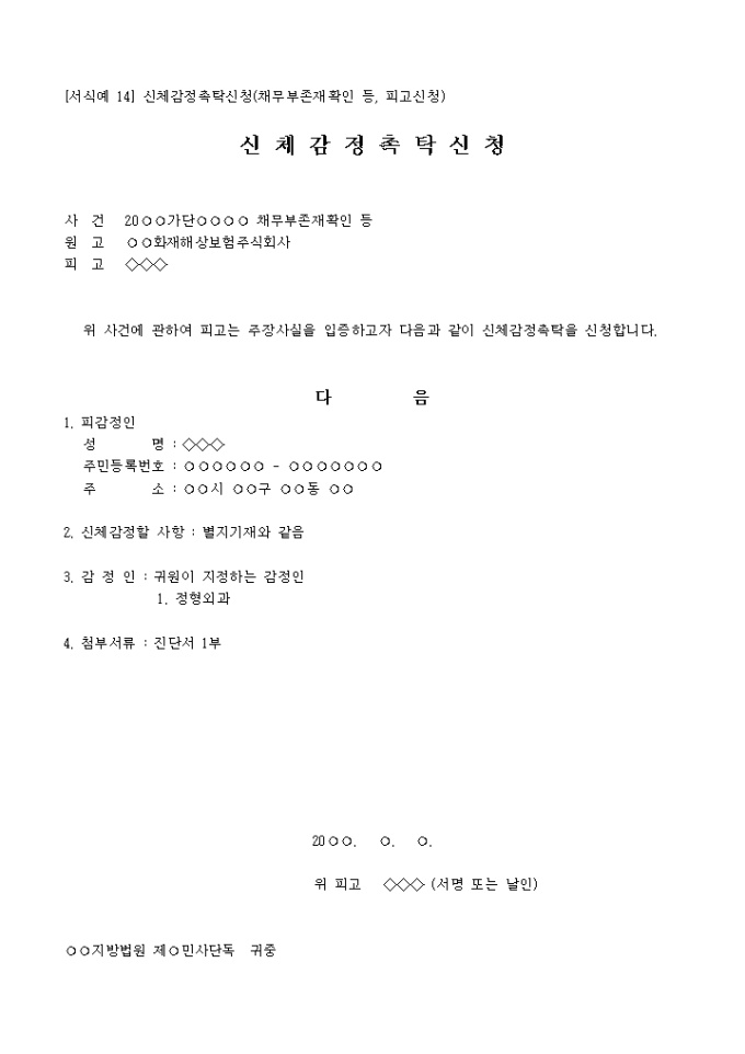 [서식예 14] 신체감정신청{손해배상(자)}은 신체에 상해가 가해졌을 경우 얼만큼 다쳤는지 감정을 요구하는 신청서입니다.