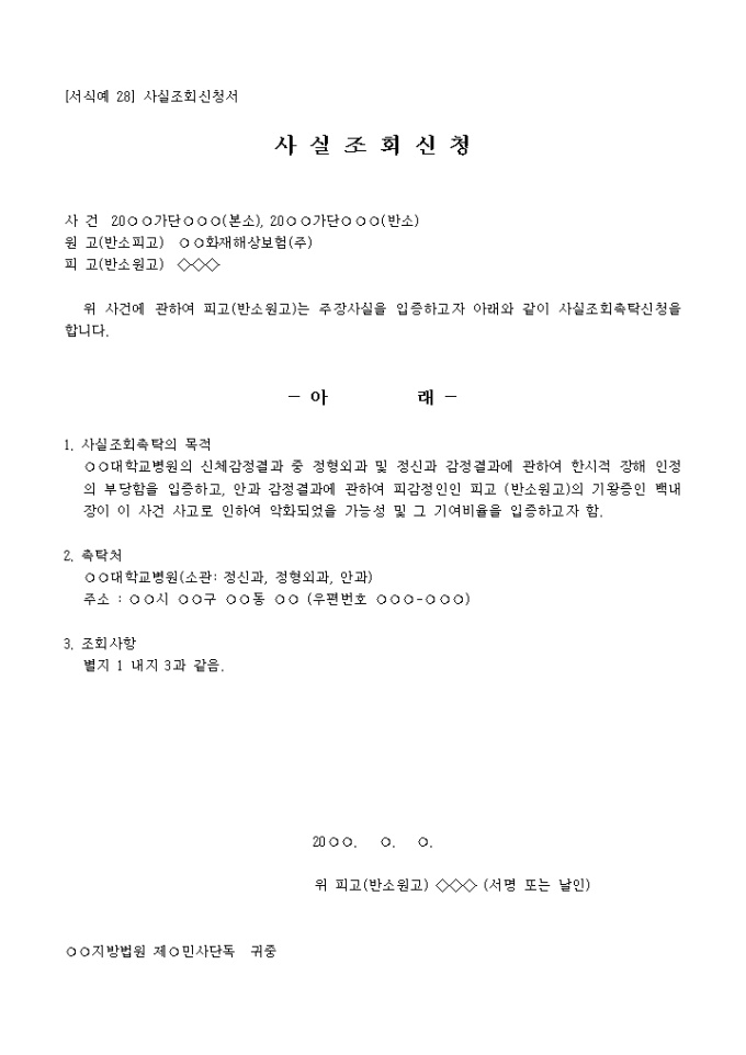 9,000원/월[서식예 28] 사실조회신청(신체감정관련)은 신체 감정에 관련하여 사실여부를 조회하는 신청서입니다.