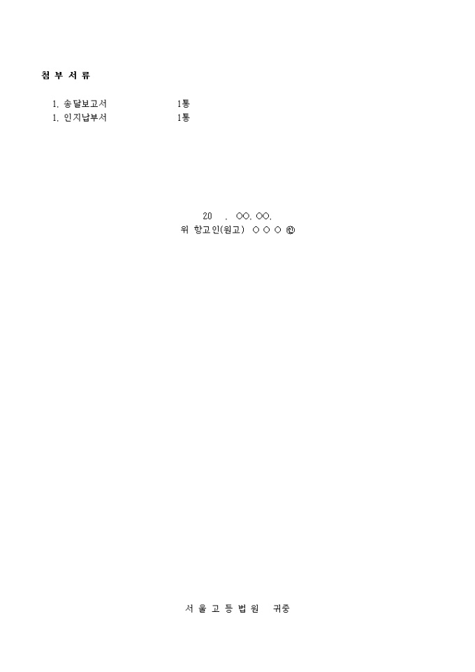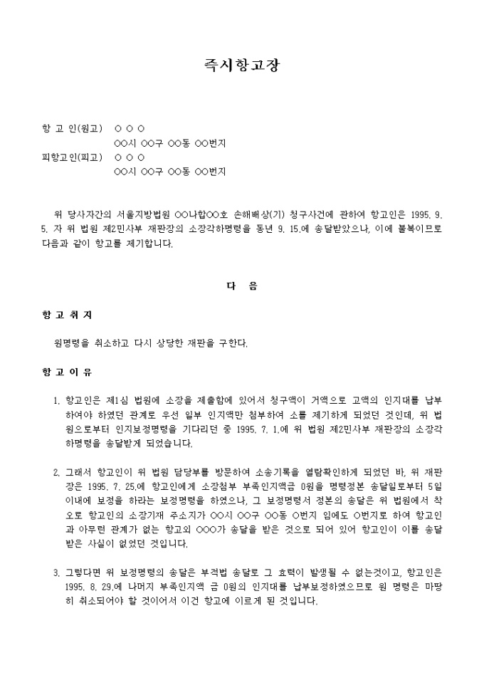 9,000원/월송달보고서 1통, 인지납부서 1통이 첨부되어야 하는 즉시항고장 입니다.