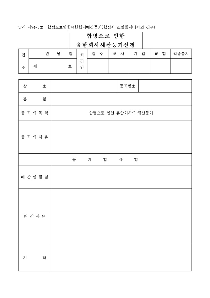9,000원/월합병시 소멸회사에서의 경우에 유한회사의 해산을 목적으로 하는 등기로써 해산일자, 해산사유등으로 구성되어 있습니다.