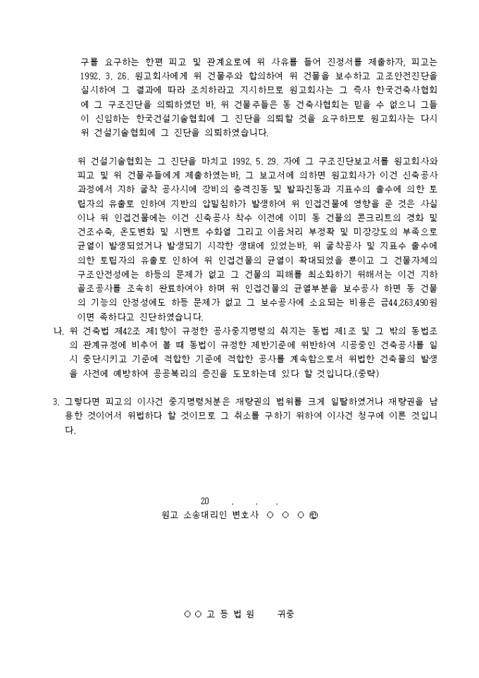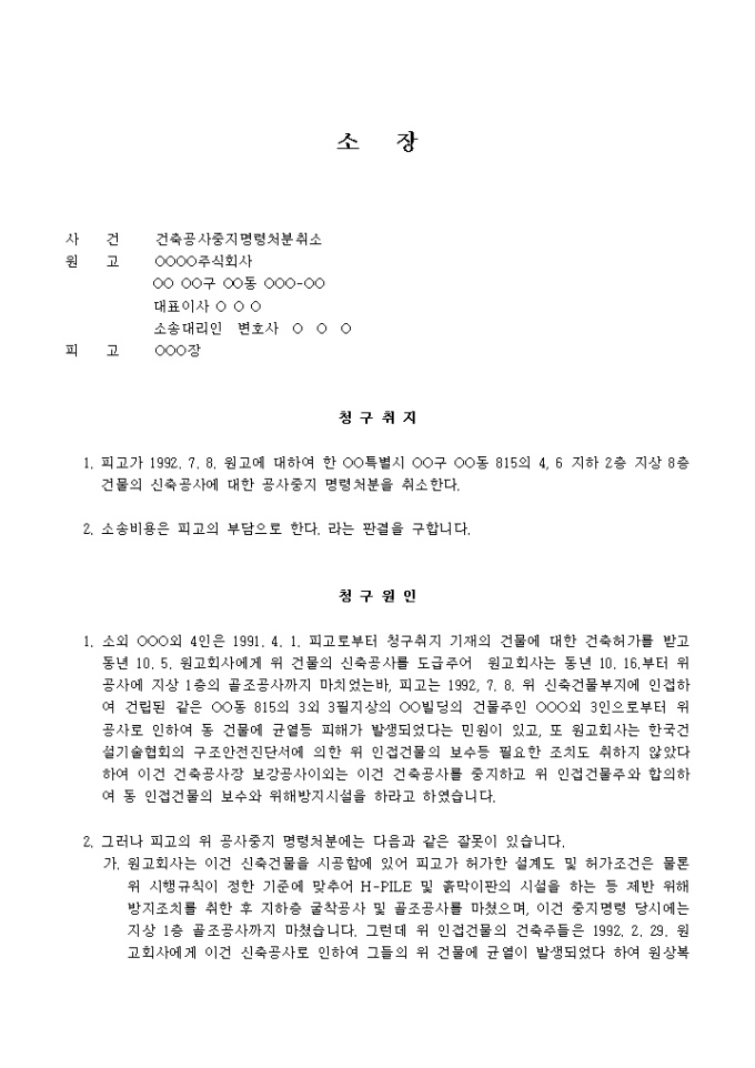 9,000원/월재량권의 범위를 크게 일탈하였거나 재량권을 남용한 것은 위법 이므로 그 취소를 구하기 위한 건축공사중지명령처분취소 양식입니다.