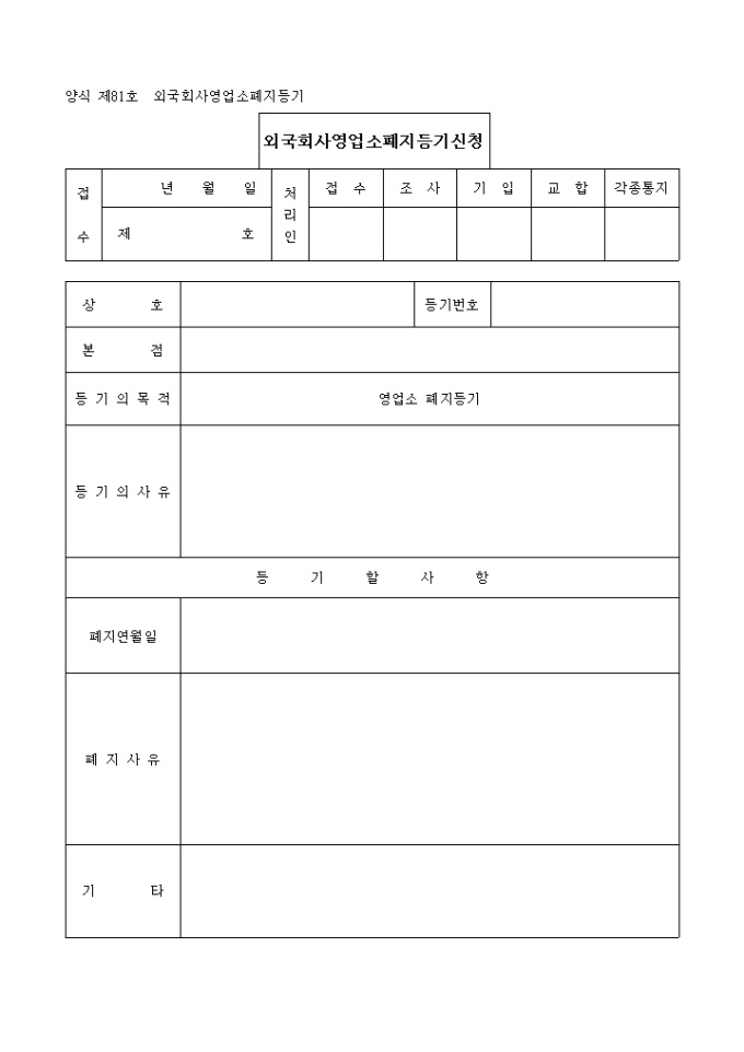 9,000원/월외국회사 영업소 폐지를 목적으로 하는 등기로써 폐지일자, 폐지사유등으로 구성되어 있습니다.