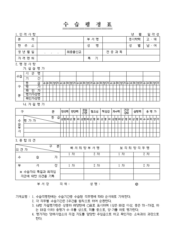 수습사원의 창의력, 판단력, 성실근명, 협조심등의 자질과 실습내용을 평가하는 양식입니다. 수습직명란에는 수습기간중 수습된 직무명에 따라 순서대로 기재합니다.