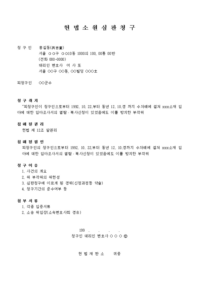 9,000원/월사건의 개요, 위헌성, 심판청구에 이르게 된 경위, 청구기간의 준수여부를 청구이유에 서술하고 각종 입증서류, 소송 위임장(소속변호사회 경유)이 첨부되어야 합니다.