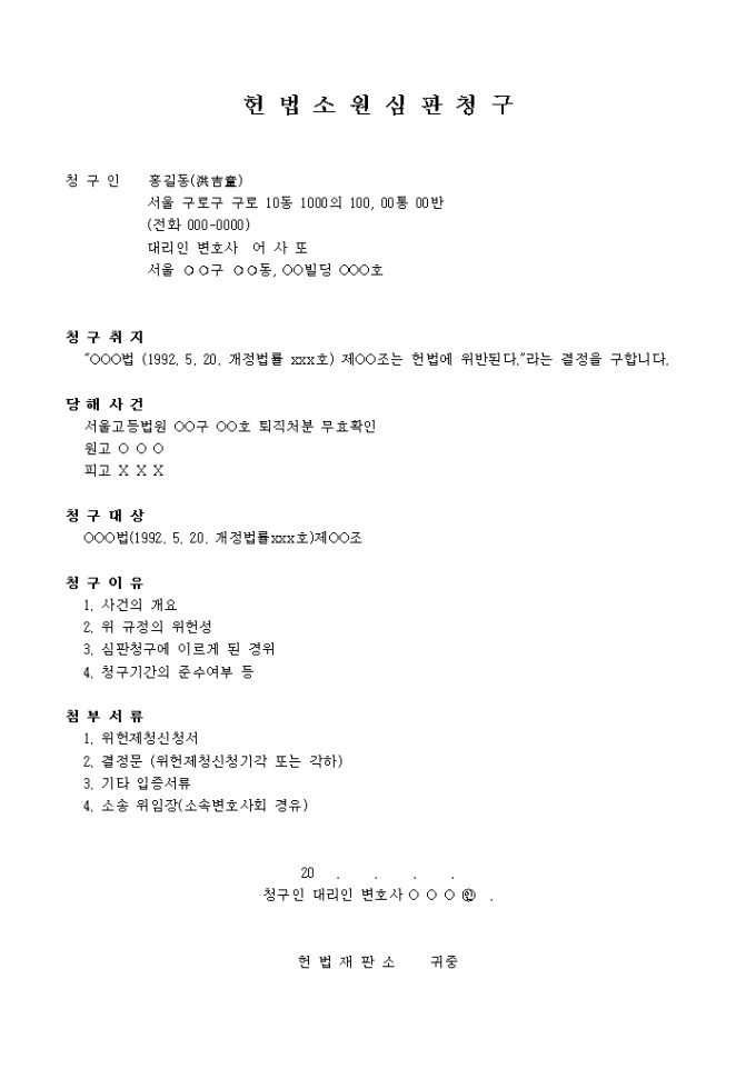 사건의 개요, 규정의 위헌성, 심판청구에 이르게 된 경위, 청구기간의 준수여부를 청구이유에 서술하고 위헌제청신청서, 결정문(위헌제청신청기각 또는 각하), 기타 입증서류, 소송 위임장(소속변호사회 경유)이 첨부되어야 합니다.