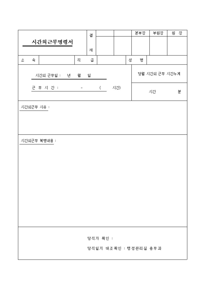 9,000원/월시간외 근무에 관한 시간, 근무일, 사유, 복명내용등을 작성하여 명령하는 양식입니다. 소속이나 직급, 성명등도 명시하여 둡니다.