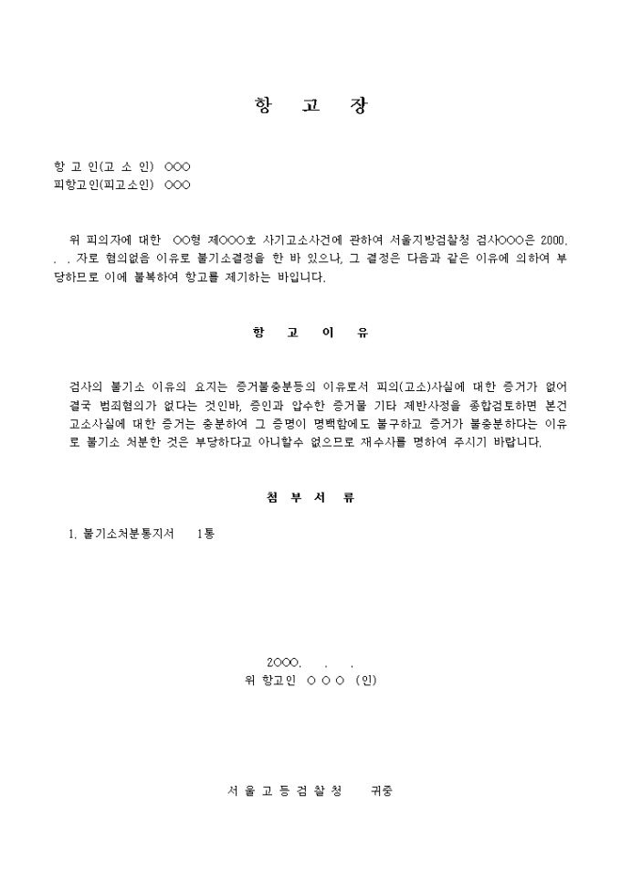 9,000원/월검사의 불기소 이유의 요지는 증거불충분등의 이유로서 피의(고소)사실에 대한 증거가 없어 결국 범죄혐의가 없다는 것인바, 증인과 압수한 증거물 기타 제반사정을 종합검토하면 본건 고소사실에 대한 증거는 충분하여 그 증명이 명백함에도 불구하고 증거가 불충분하다는 이유로 불기소 처분한 것은 부당하다고 아니할수 없으므로 재수사를 명하여 주시기 바랍니다는 내용의 항고장 입니다.