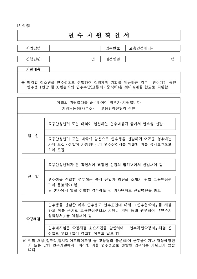 연수지원확인서는 사업장명, 신청인원, 배정인원, 지원내용 등으로 구성되어 있며 알선, 선발, 약정체결의 지원절차를 준수하여 야 정부의 지원을 받을 수 있습니다.