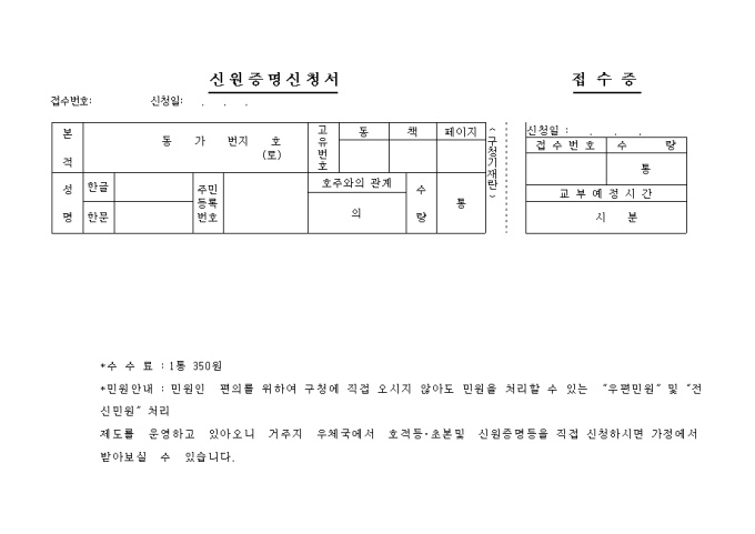 9,000원/월구청등에 신원증명을 신청할 때 사용하는 신원증명신청서 양식입니다. 본적, 성명, 주민등록번호등 개인신상정보를 기입합니다.