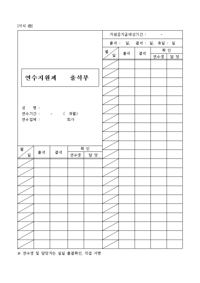 9,000원/월연수지원제 출석부입니다. 성명, 연수기간, 연수업체, 지원금 지급 대상기간, 출석, 결석, 일자, 확인으로 구성되어 있습니다.
