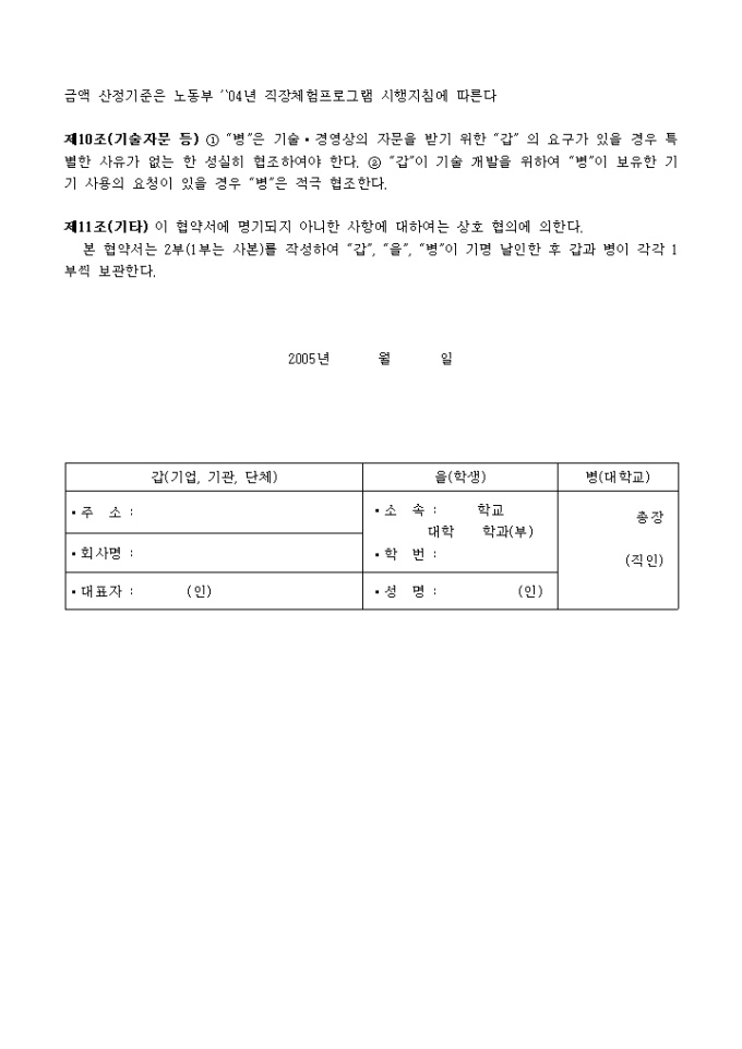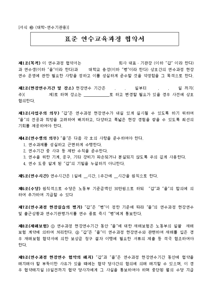 9,000원/월대학,연수기관용 표준연수교육과정 협약서는 목적, 현장연수기간 및 장소, 사업주의 의무 등 모두 11개의 조항으로 이루어져있습니다.
