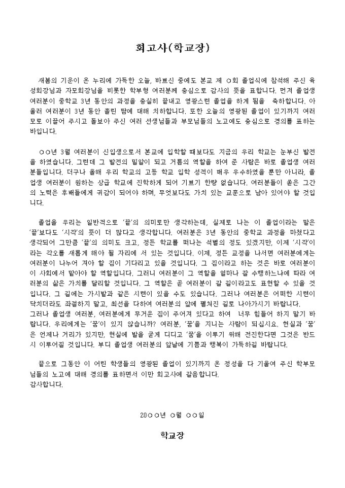"여러분이 신입생으로서 본교에 입학할 때보다도 지금의 우리 학교는 눈부신 발전을 하였습니다. 그런데 그 발전의 밀알이 되고 거름의 역할을 하여 준 사람은 바로 졸업생 여러분들입니다. 더구나 올해 우리 학교의 고등 학교 입학 성적이 매우 우수하였을 뿐만 아니라, 졸업생 여러분이 원하는 상급 학교에 진학하게 되어 기쁘기 한량 없습니다. 여러분들이 쏟은 그간의 노력은 후배들에게 귀감이 되어야 하며, 무엇보다도 가치 있는 교훈으로 남아 있어야 할 것입니다"라는 내용의 학교장 회고사입니다.
