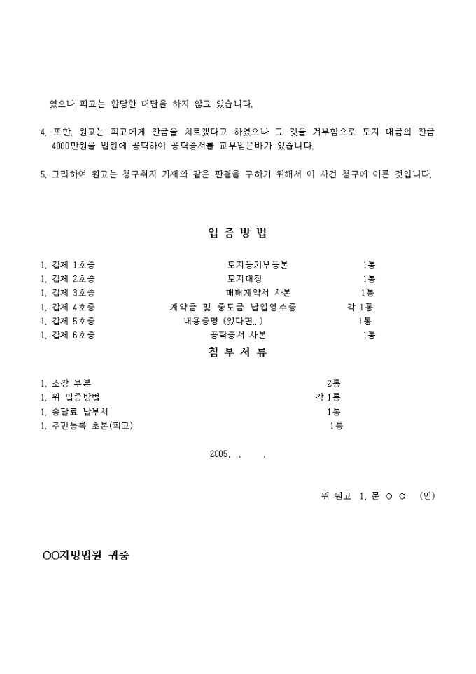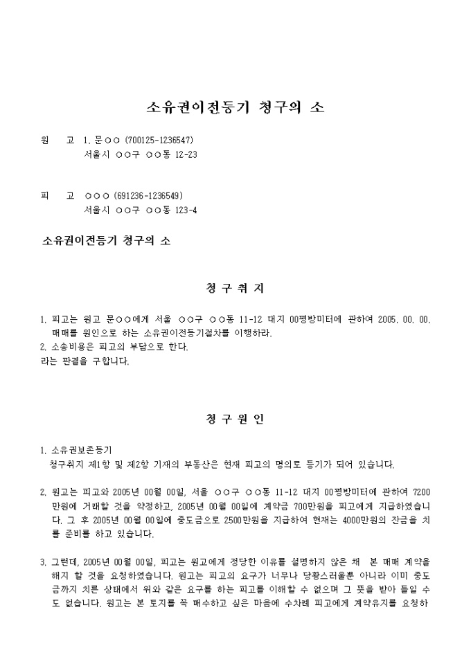 자금치르기 전에 매도인이 매매를 해지하겠다고 했을 때 이에 대해 소유권이전 등기청구의 소를 진행할 때 사용하는 소장 샘플입니다.