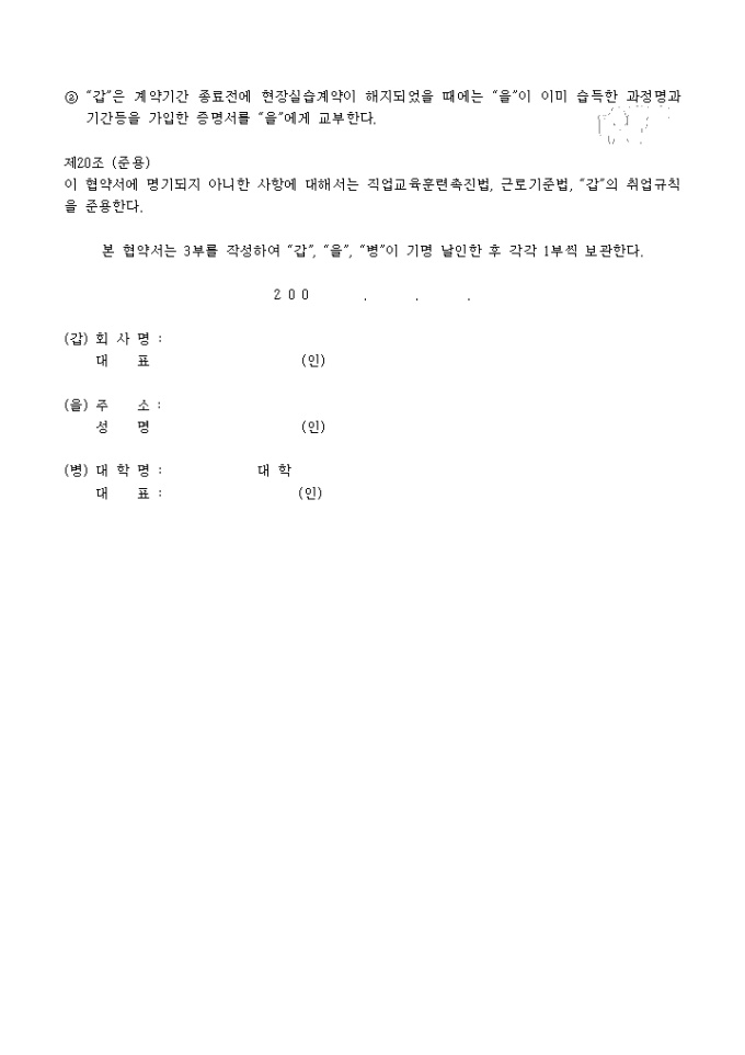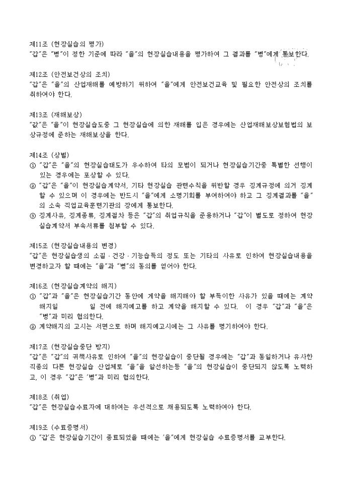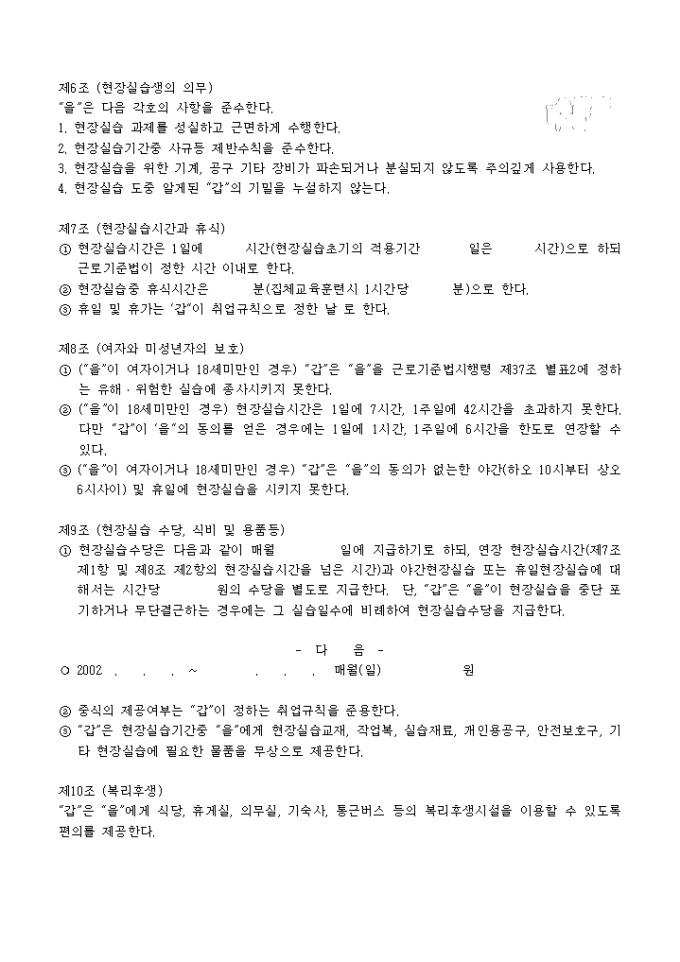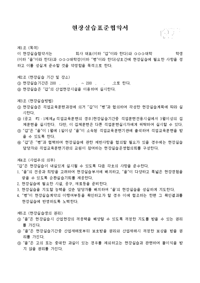 9,000원/월노동부고시에 따른 현장실습 표준협약서 양식입니다. 대학이나, 고등하고, 직업훈련업체와 회사, 실습자간의 작성 협약서양식입니다.