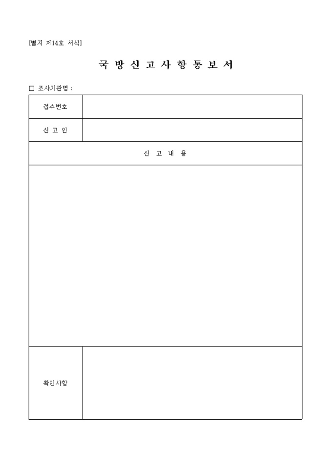 9,000원/월조사기관명, 접수번호, 신고인, 신고내용, 확인사항을 기재하는 국방신고사항통보서 입니다.
