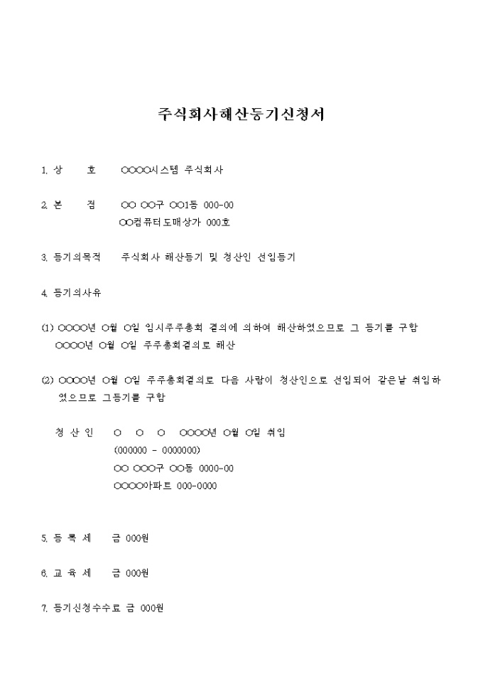 9,000원/월임시주주총회에서 회사의 해산을 결의하고 청산인을 선임하였음을 등기하는 주식회사 해산등기 신청서입니다.