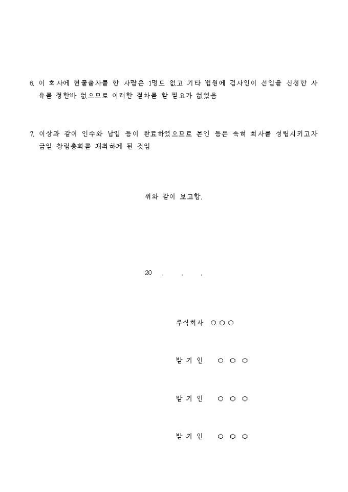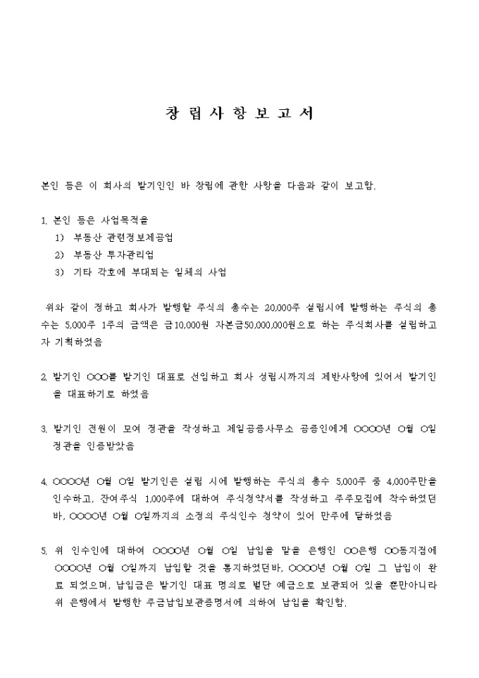 회사의 발기인이 창립에 관한 사항을 보고하는 창립사항 보고서입니다.
