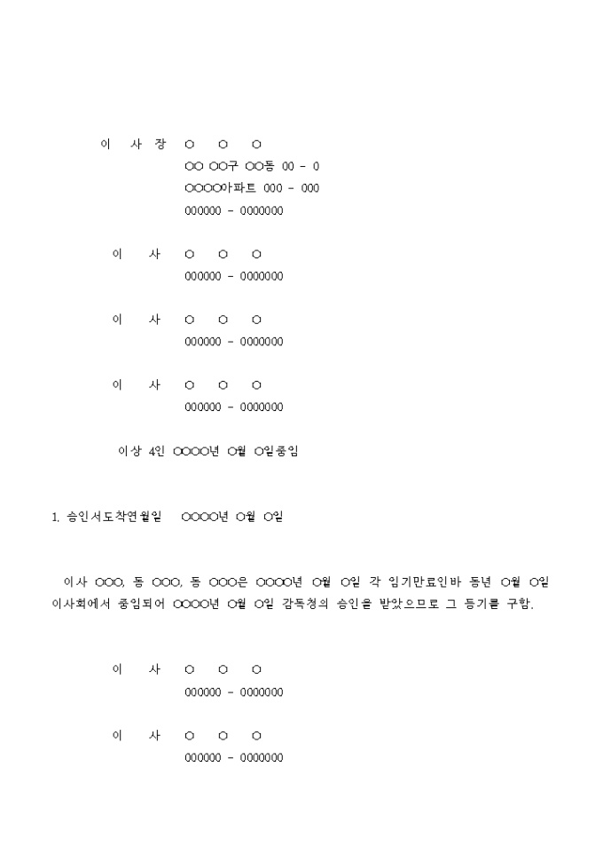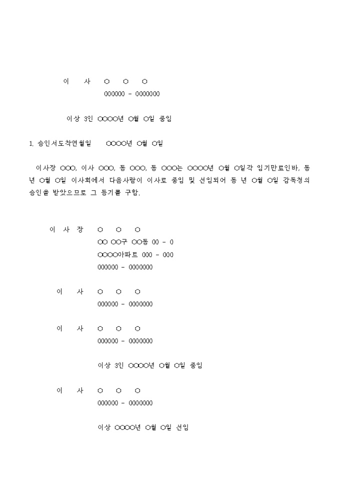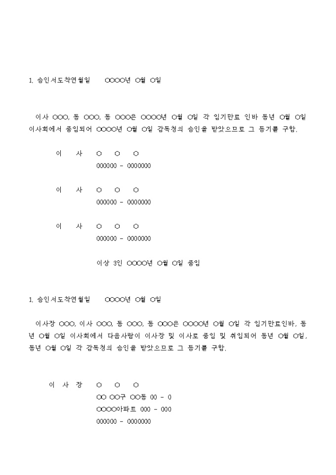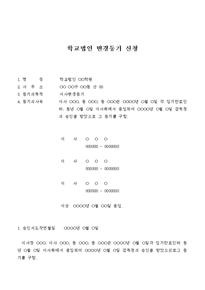 이사의 임기가 만료된 후 이사회에서 중임되어 감독청의 승인을 받았으므로 그 등기를 구하는 학교법인 변경 등기 신청서입니다.